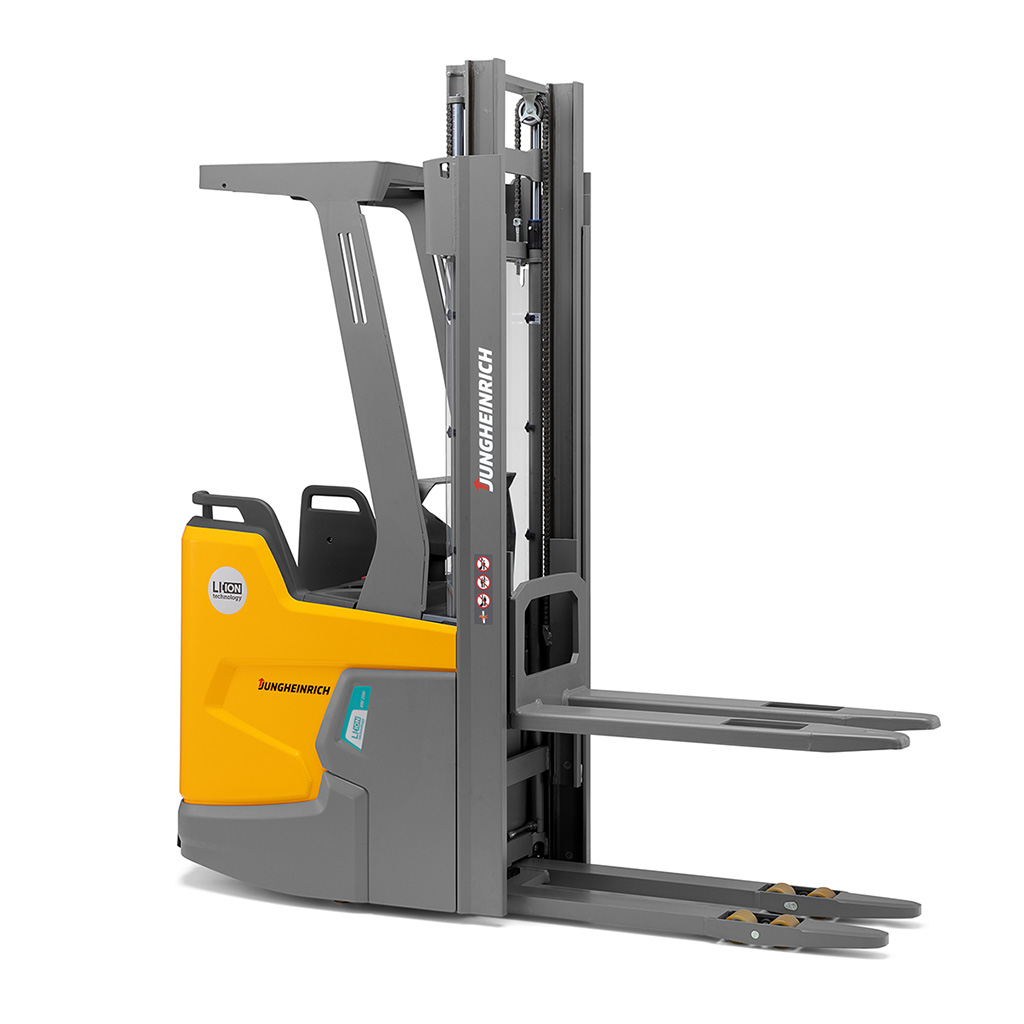The compact lithium-ion battery enables a completely new vehicle design. Jungheinrich has thus succeeded in significantly improving the agility of stacker trucks. Thanks to their compactness, the trucks of the ERCi family set new standards in manoeuvrability. Taking advantage of a new type of mast that uses the same profiles as Jungheinrich's counterbalance trucks, the trucks also have a higher residual capacity of at least 100 kg. In addition, the new mast entry damping system ensures smooth mast transitions when lowering.